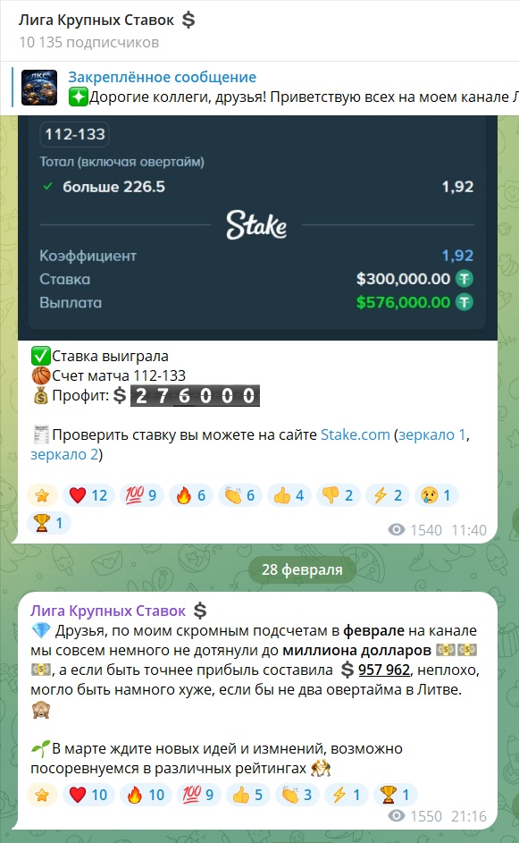 Отзывы о телеграмм-канале «Лига Крупных Ставок»: обзор деятельности каппера macbettor, качество прогнозов