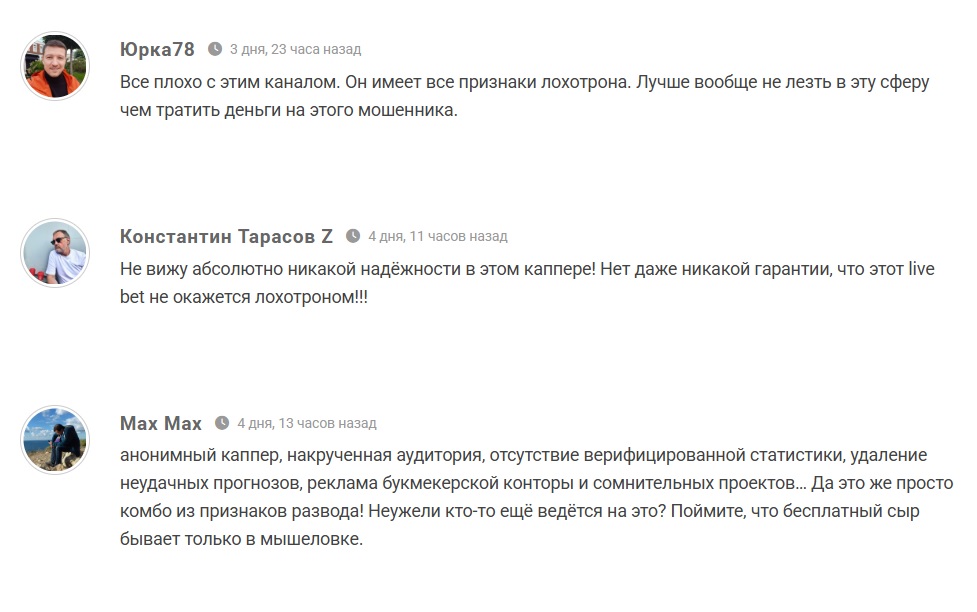 Если вы выявили признаки, как на канале Live Bet, в других проектах, будьте бдительны: скорее всего, это мошенники.