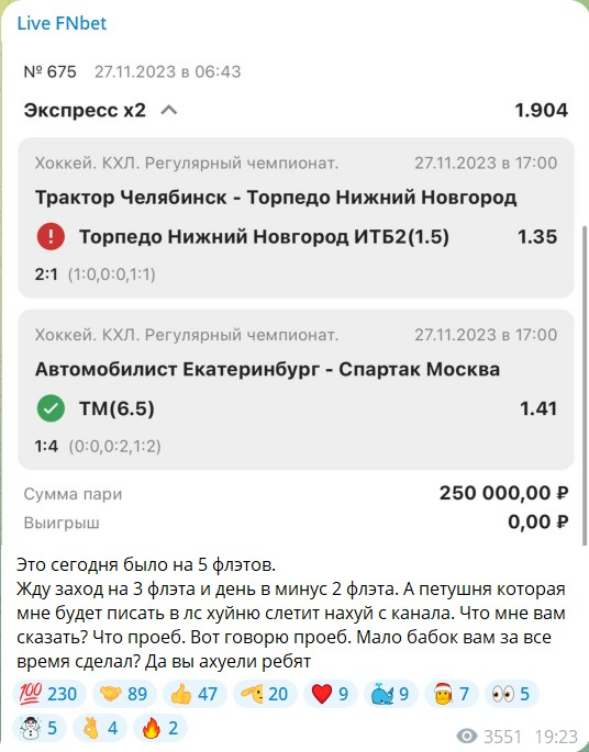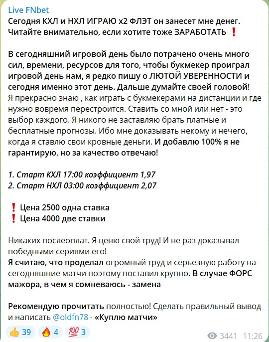 Также с ним работают двое менеджеров @FNbetFB и @FNtennis. Они занимаются обработкой клиентов. Прогнозисты действуют по одному сценарию – убеждают подписчиков в высокой проходимости ставок, блокируют неудобные вопросы и собирают деньги за доступ к VIP-прогнозам. Но реально заработать деньги по ним не получится.