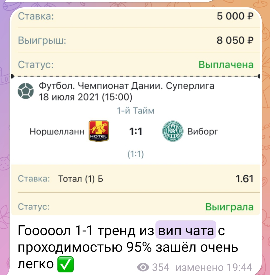 В Telegram публикуются не только бесплатные, но и платные ставки на спорт. Чтобы их получать, не нужно вступать в отдельный ВИП чат, их можно купить лично у каппера.