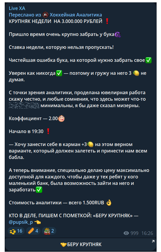 Прогнозист — Алексей Алиев (Pupsik_p). Ему также принадлежит ТГ-канал Хоккейная аналитика, в котором даются прематч-ставки. У него негативная репутация в интернете, что не мешает его работе и распространению прогнозов на спорт.