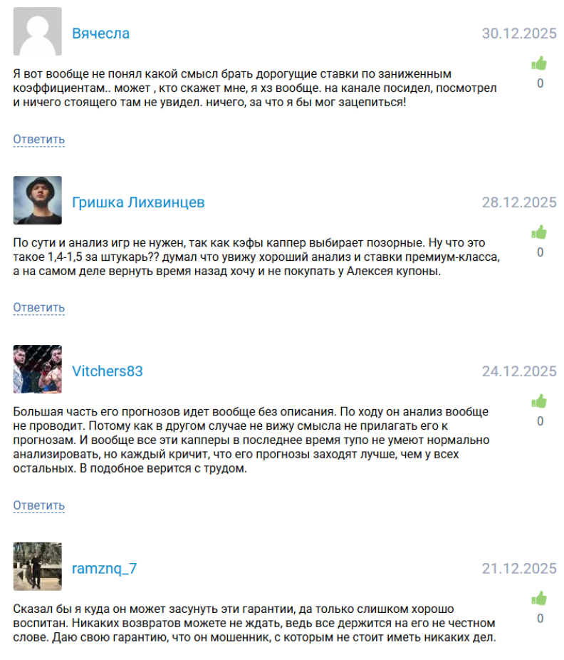 Комментарии ограничены, отзывы клиентов не публикуют. На независимых сайтах каппер обвиняется в мошенничестве. Есть разоблачения развода на его проектах и жалобы беттеров.