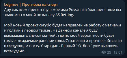 Капер проекта Loginov | Футбольная аналитика в Telegram предлагает своим клиентам ставить в live. Для игры в БК он используют стратегию тоталов на голы в первом тайме, отчитывается обо всех выданных прогнозах. Рассмотрим, заслуживает ли аналитик доверия игроков.