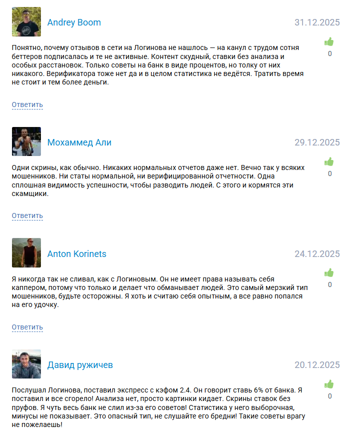 В контенте ТГ-канала Loginov_bet нет комментариев или отзывов пользователей. На сторонних сайтах у проекта негативная репутация с разоблачением сомнительного качества ставок. Есть и жалобы клиентов.