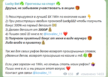 Канал Lucky Bet — это типичный представитель реферальных капперских схем. За бесплатными ставками скрывается простая цель: заманить людей в букмекерскую контору и получать комиссию с их проигрышей. Ни о каком профессионализме или аналитической глубине речи не идет.