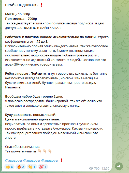 Прогнозист ведет вип-чат. Своим подписчикам он предлагает стать участником платной рассылки. Цены на порядок выше, чем у конкурентов.