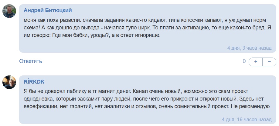 Прогнозист использует бесплатный труд подписчиков, обещая высокую прибыль от ставок и прогнозов, но в результате тут дают лишь виртуальные рубли. «Магнит Денег» — ресурс-фейк с нулевым рейтингом. Экспресс-прогнозы и советы каппера Nan не приносят заработка.