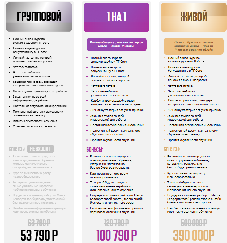 В Телеграмм и на официальном сайте доступно несколько платных тарифов обучения от основателя курса Belfort School. Цены:
