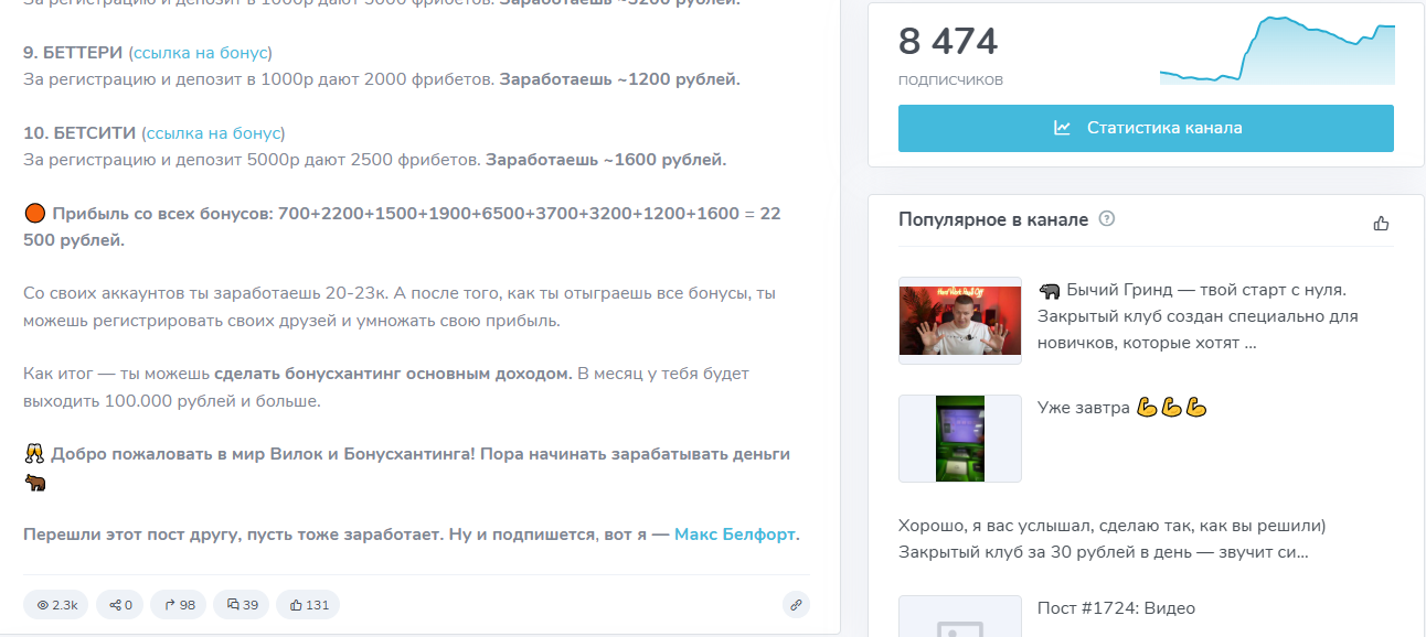 Макс Белфорт также ведет блог в Telegram, где продолжает убеждать аудиторию в том, что его стратегия ставок на спорт надежная, обеспечивает стабильный доход в несколько сотен тысяч за месяц. Подписчики на канале не накручены ботами – из 8,4 тыс. человек треть просматривает, комментирует новые посты.