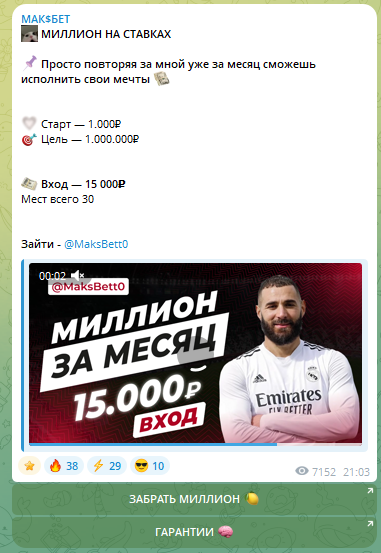 МАК$БЕТ — проект каппера Максима по продаже ставок на спорт. В telegram он продает экспрессы, а также обещает поднять банк клиентам, что легко может оказаться разводом. Разоблачение данного персонажа просто напрашивается.
