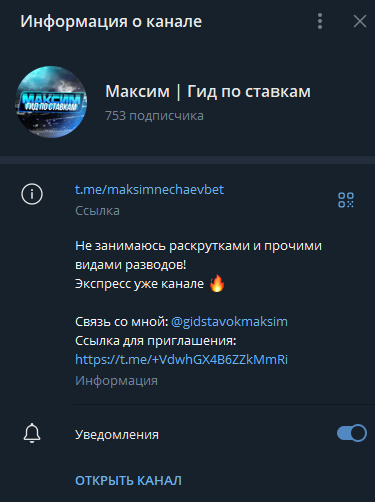 Проект «Максим Гид по Ставкам» (maksimnechaevbet) в Telegram позиционируется как источник надежных прогнозов на спорт. Автор обещает высокую проходимость, прибыль и гарантии результата. Но проверка показала: перед нами старый мошеннический проект.