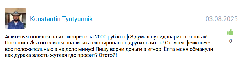 Есть отдельное сообщество с «отзывами», где все комментарии исключительно положительные и шаблонные. Ни одного реального негативного отклика нет, а возможность оставлять реакции отключена. На сторонних ресурсах встречаются жалобы: пользователи платили за прогнозы, но не получали контент.