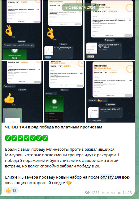 Стоимость одной ставки составляет 1000 рублей. Прогнозы распространяются по схеме постоплаты, что теоретически снижает финансовые риски для клиентов. По такой стратегии аналитик рассылает разным клиентам противоположные предикты, что позволяет в любом случае демонстрировать выигрышные прогнозы, скрывая проигрышные. Примером близкой тактики можно назвать отзывы капера империя экспрессов, где фиксируются те же самые приёмы.