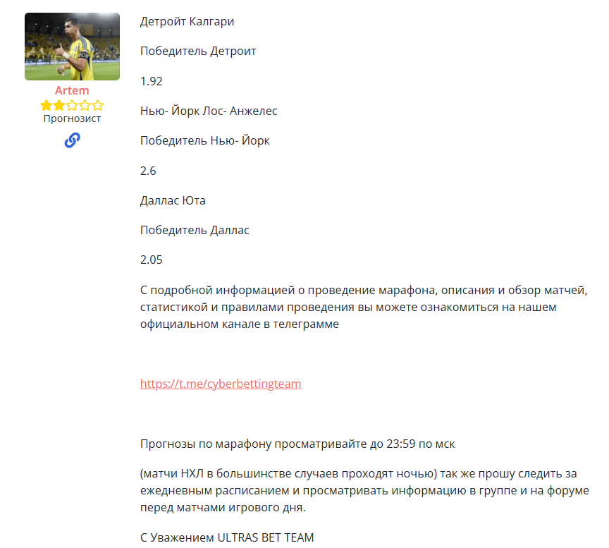 Телеграм-канал «CYBERSTATION ULTRAS BET» публикует прогнозы на спорт, в основном на матчи NHL. Аудитория небольшая — всего 300 подписчиков. В постах размещают прогноз на матч, коэффициент и скрин купона из БК.