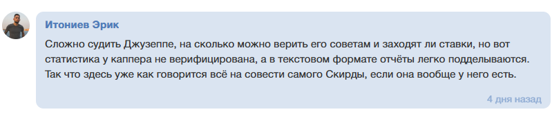 Проект работает в telegram и собрал более 1 500 подписчиков, но активная аудитория минимальна, что может указывать на фейк и накрутку. Каппер Евгений Скирда (MasterGiuseppeR) не подтверждает профессиональный статус через верификатор.