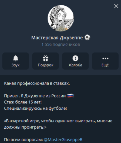 Телеграм-канал Мастерская Джузеппе позиционируется как капперский проект с аналитикой футбольных матчей. Автор предлагает беттерам прогнозы на спорт, заявляя о большом опыте и стабильной прибыли. Однако при проверке ресурса возникают вопросы к доверию, репутации и реальным результатам ставок.