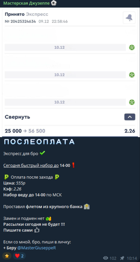 Платный формат представлен экспрессами по постоплате, цена от 555 рублей. ВИП-чат отсутствует, гарантия прибыли не заявлена. Отчеты публикуются в виде скринов купонов и текстовых итогов, но без проверки статистики такие результаты нельзя считать надежными. Рекламы БК и прямой схемы заработка через контору не выявлено.