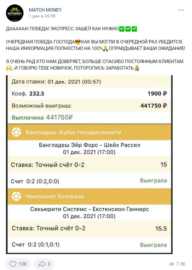 Match Money – это сообщество ВКонтакте, в котором 40 000 подписчиков. Его автор предлагает прогнозы на футбольные матчи, в том числе и так называемые «договорные встречи». Автор проекта, Вадим Матчмани, уверяет подписчиков в высокой проходимости прогнозов и обещает быстрый заработок на ставках. Мы провели проверку канала и оценили качество его услуг.