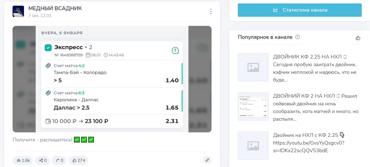 Контент — экспрессы с коэффициентами 1.8–2.5, иногда выше. Чаще всего это двойники, реже ординары. Анализ матчей поверхностный или полностью отсутствует. Игроку предлагают готовую ставку без объяснения логики выбора исходов. Статистика публикуется выборочно, верификатор не используется, отчеты состоят из скринов купонов, которые при желании легко удалять.