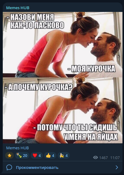 Канал Memes HUB запущен в ноябре 2025 года и набрал более 52 000 подписчиков. Звучит круто, но активность аудитории подозрительно низкая — явный признак, что подписчики тут в основном фейки.