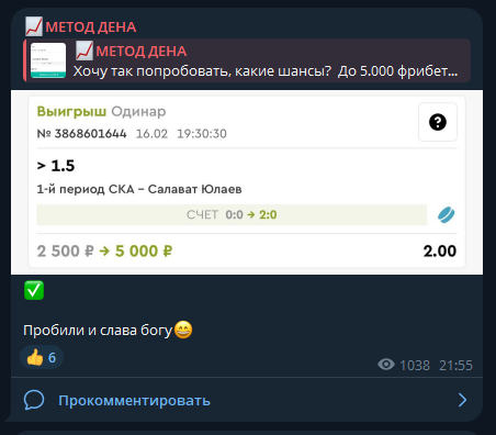 Проект «МЕТОД ДЕНА» — закрытый канал со спортивными прогнозами. Его автор утверждает, что публикует исключительно примеры своих ставок. Призывов повторять их нет, но подписчикам демонстрируют стабильную игру в плюс. Разбираемся, действительно ли на ресурсе публикуют прогнозы с высокой проходимостью.