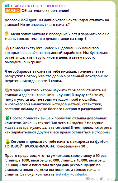 Отзывы о телеграм-канале Михаила Коваленко: реальная проходимость предиктов каппера stavky kovalenko