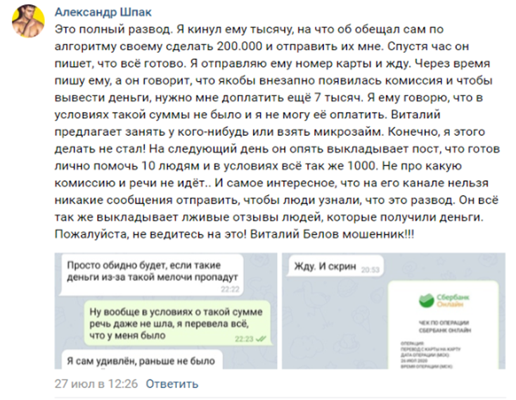 Участникам паблика предлагают перевести автору 1 000 рублей, после чего создатель группы с помощью неизвестных алгоритмов за 2 часа увеличит изначально отправленную сумму в 200 раз. В чем состоит выгода Виталия непонятно. В публикациях не указана цена за раскрутку счета. Вот только зачем нашему герою искать других людей и помогать им получить легкие деньги, если он способен в короткие сроки зарабатывать шестизначные суммы?