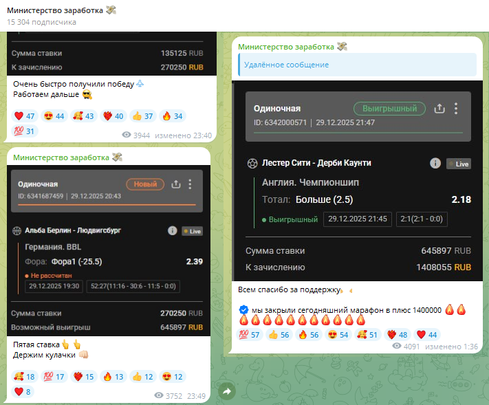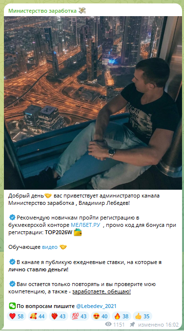 Паблик «Министерство заработка» существует около пяти лет. Аудитория за это время выросла до 15 тысяч подписчиков. Каппер Lebedev 2021 показывает беттерам схему заработка в букмекерских конторах, основанную на марафонах. По сути, это тот же экспресс, растянутый во времени.