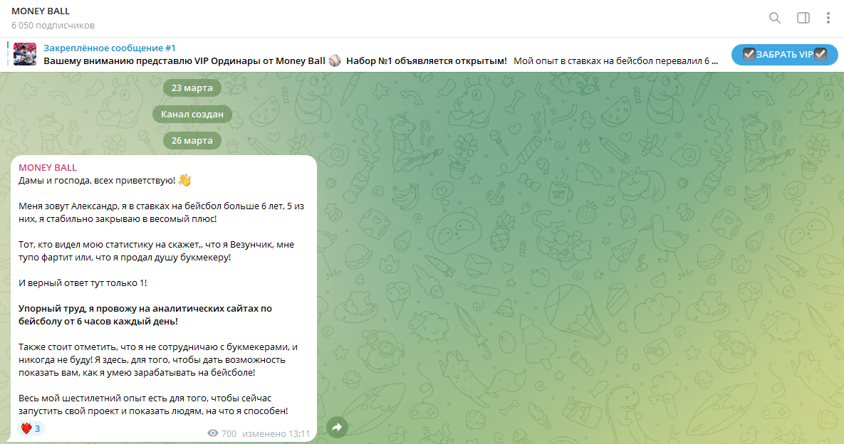 Канал MONEY BALL был создан весной 2024 года. Публикации стали появляться почти сразу. Перерывов в работе этого каппера не было. Александр Петров в приветственном посте заявил, что работает исключительно с бейсбольными матчами. На канал подписано 6,5 тысяч человек, однако активность аудитории вызывает вопросы — часть просмотров и реакций может быть накручена.