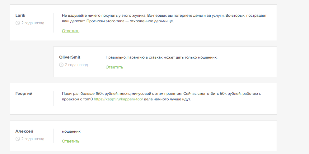 Однако гарантий нет: ни замены, ни компенсации за минус. Если результат негативный, прогнозист избегает жалоб, пользуясь закрытыми комментариями. Это делает проект похожим на развод, где ответственность лежит только на клиенте.