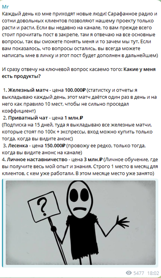 Сегодня мы изучим проект mr freeman, отзывы, телеграмм-канал и статистику проходимости владельца ресурса. Создатель паблика с названием Mr раньше вел другой паблик, который можно было найти по тегу @mr1freee. В закрытом сообществе Mr каппер публикует предикты на футбол, хоккей, бейсбол и баскетбол. Стоит отметить, что ранее аналитик стабильно делился бесплатными советами с аудиторией. Однако со временем бесплатных пари становилось меньше, а акцент делался на продажу платных прогнозов.