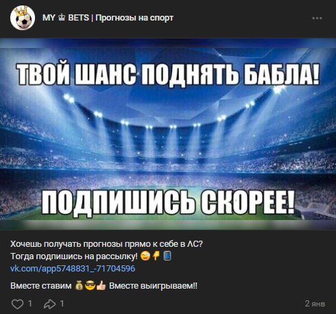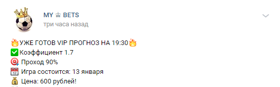 Мы рекомендуем избегать подобных групп. В них пользователь рискует быть обманутым и потратить деньги на фейк прогнозы.