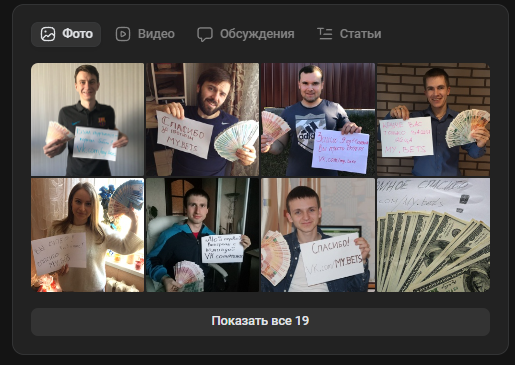 Все фотографии оформлены в едином стиле. Люди демонстрируют пачки денег и ссылаются на сообщество. Все подобные отзывы являются фейком и были куплены через специальные биржи.
