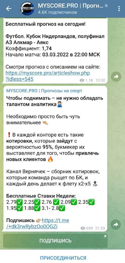 На телеграмм-канал Myscore Pro подписано более 4 000. человек, но просмотры не превышают 300–400 — это говорит о неактивной или накрученной аудитории. Комментарии отключены. Контент сводится к бесплатным прогнозам и постоянной рекламе оффшорных букмекеров. Через партнерские ссылки проект получает процент с проигрышей пользователей.