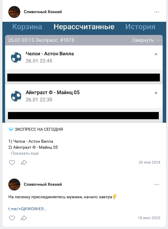 Аудитория ВКонтакте – 536 пользователей. Последний пост был опубликован 26 января 2024 года. Бесплатные прогнозы предоставляются с кратким описанием предстоящих игр, однако подробной аналитики или разбора матчей не наблюдается. Платные экспрессы в Мыслях Каппера предлагаются без верифицированной статистики, что затрудняет оценку их эффективности. В бесплатной ленте прогнозист ставит на фаворитов, что не позволяет рассчитывать на хорошую прибыль.