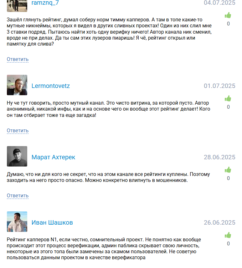 Положительных отзывов и комментариев довольных пользователей в ленте нет. Проект ReitigKappersN1 упоминается в разоблачениях мошеннических схем на профильных сайтах. Удалось найти и жалобы на него от реальных беттеров.