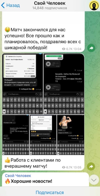 Наш Человек — капперский Телеграм проект, который предлагал ставки на спорт. Канал освещал футбол и занимался продажей информации по договорным матчам лиг Азии. Сама по себе услуга договорных матчей относится к мошенничеству. Инсайдерскую информацию не распространяют в Telegram. Чтобы досконально во всем разобраться, команда нашей редакции инициировала проверку. Приводим наше разоблачение.