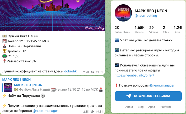 Деятельность проекта NEON Betting в ТГ и на сайте