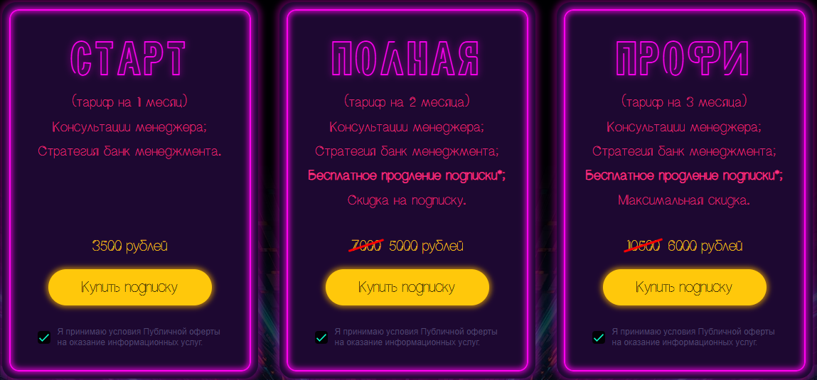 В ТГ есть бесплатные и платные услуги. Клиенты могут проверить эффективность экспрессов и ординаров с минимальными рисками или купить подписку на ВИП чат. На сайте о них опубликована подробная информация с возможностью сразу оформить подписку.
