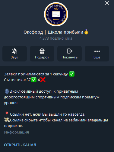ТГК работает с 2023 года и был за это время неоднократно переименован. На момент проверки проект называется «Оксфорд | Школа прибыли». Аудитория насчитывает более 4000 игроков. Активны менее четверти пользователей, что может свидетельствовать о накрутке подписчиков.