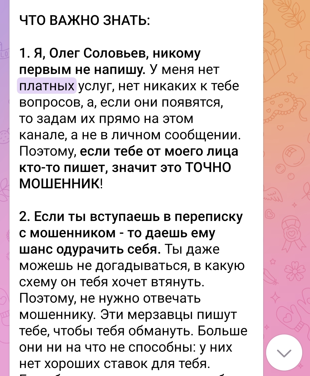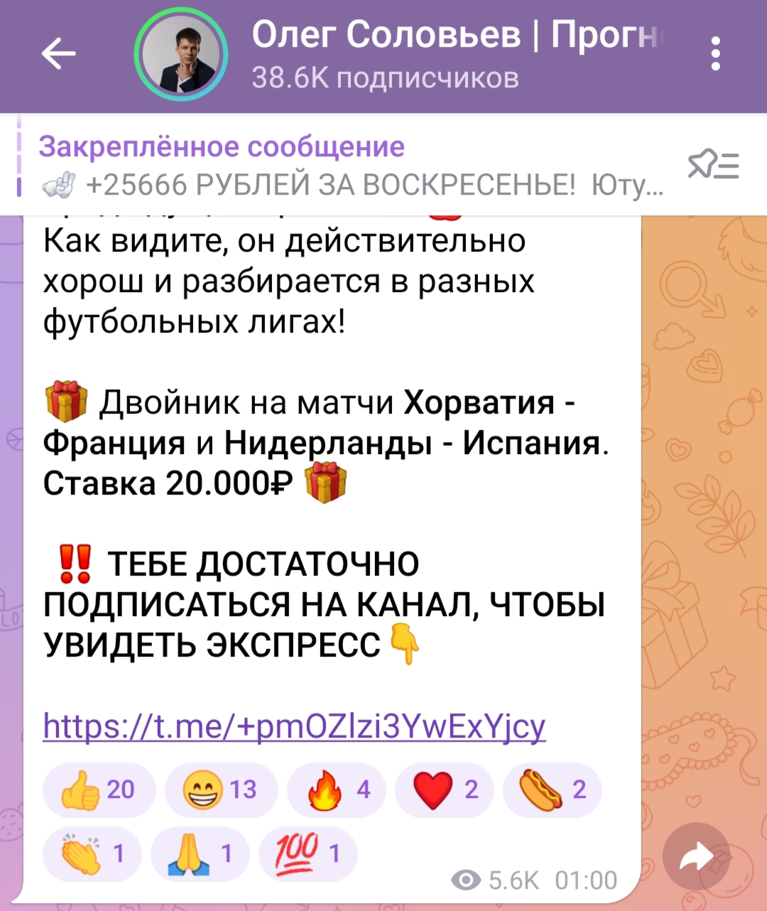 В Telegram полностью отсутствуют платные экспрессы, подписки на ВИП чаты. Прогнозист предупреждает, что специализируется исключительно на бесплатных услугах. Это плюс, игроки могут без вложений проверить эффективность деятельности Олега.