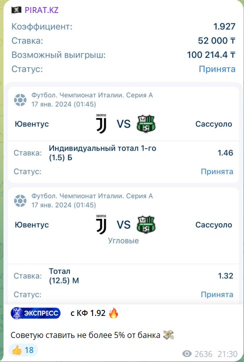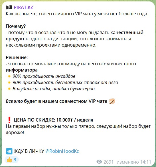 Телеграмм-канал PIRAT KZ: отзывы о сообществе, результаты ставок, на чем зарабатывает каппер RobinHoodKz