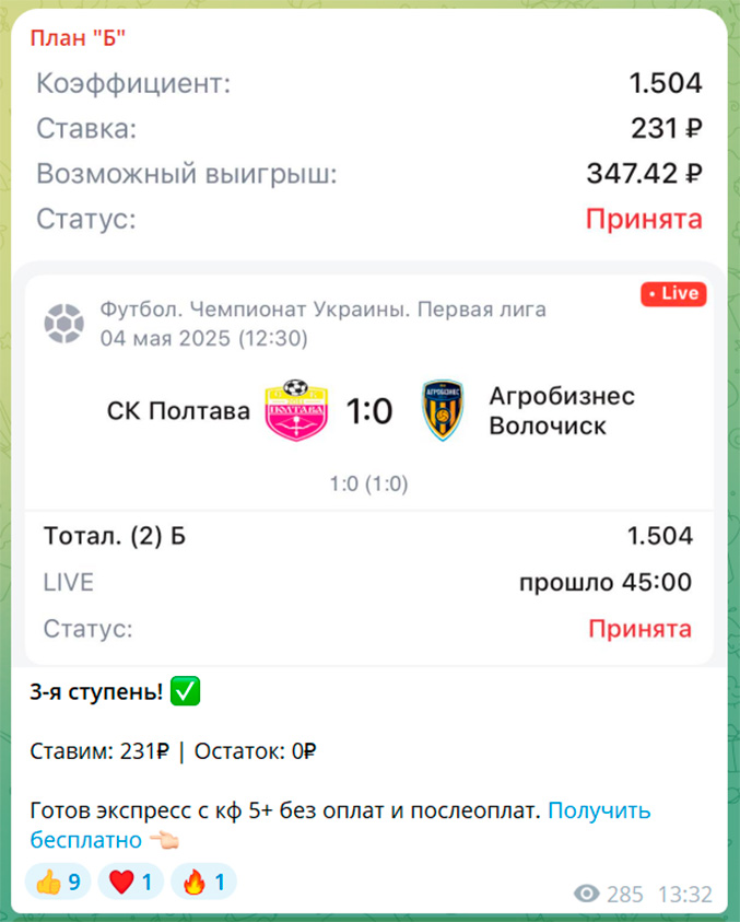В телеграмм-канале каппер предлагает клиентам ставить на футбольные матчи. С другими дисциплинами он сейчас не работает. Основная стратегия — марафоны, позволяющие увеличить сумму пари в несколько раз. Проведем детальную проверку и определим, заслуживает ли прогнозист доверия и не занимается ли мошенничеством.