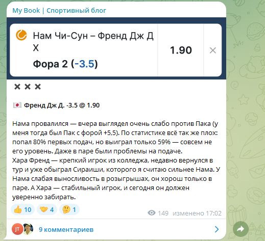 В ленте размещают по несколько прогнозов в сутки. Публикации содержат немало полезной информации. Есть анализ статистики, разбор формы каждого из соперников. Контент может принести пользу для беттеров.