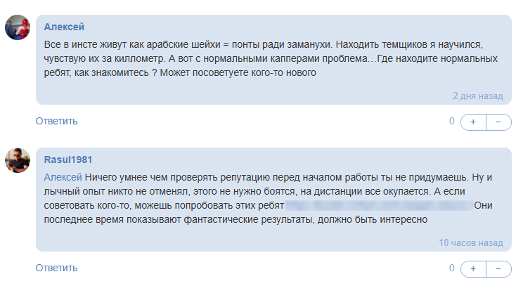 Пользователи могут участвовать в обсуждениях публикаций. Но там нет отзывов о канале. Записи связаны с конкретными ставками. Капер не демонстрирует на канале положительные отзывы клиентов.