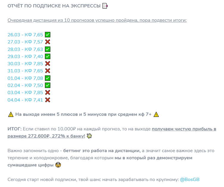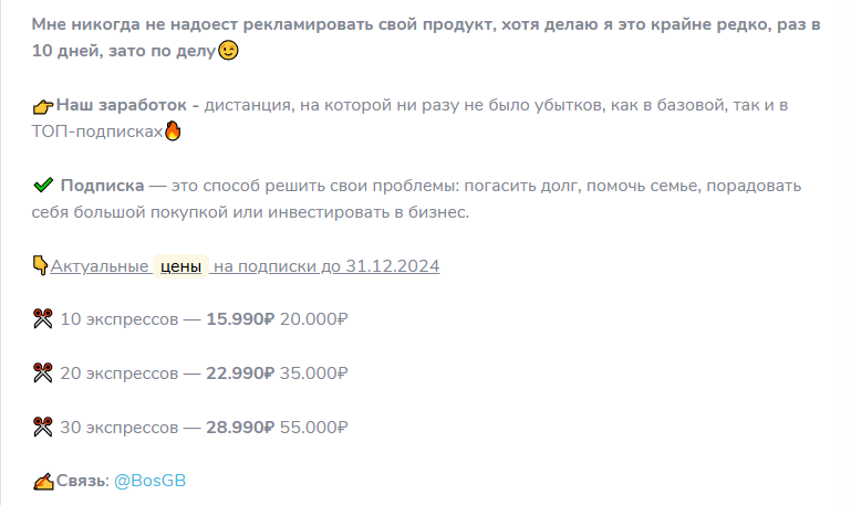 Bosgb уверенно говорит о прибыли и решении всех финансовых проблем со ставками по его советам. Адекватные гарантии окупаемости вложений не предлагает, хотя суммы подписок достаточно большие для аналитика с сомнительной репутацией. Есть риск впустую потратить время и деньги – компенсации от админа не будет.