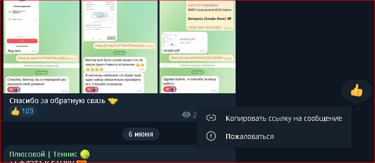 На канале Плюсовой | Теннис @Victor_Plusovoi дает бесплатные прогнозы довольно часто. Судя по отчетам, он успешно прогнозирует игры, ведь в ленте канала раньше были почти одни плюсы. Результаты выглядели не очень реалистично, учитывая частоту пари.