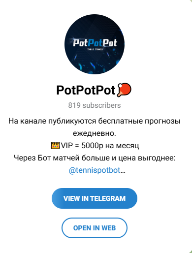 Pot Pot Pot – это Телеграм-канал, специализирующийся на прогнозах на настольный теннис. Проект начал работу в сентябре 2020 года. Его ведет каппер Валерий, заявляющий, что имеет 8-летний опыт игры в настольный теннис и первый спортивный разряд. Каппер сотрудничает с БК — в ленте регулярно публикуются промокоды и ссылки на регистрацию. Также аналитик зарегистрирован на верификаторе Vprognoze, где у него более 4000 подписчиков и опубликовано свыше 5500 прогнозов. Мы проверим качество услуг прогнозиста и сделаем выводы о том, стоит с ним работать или нет.