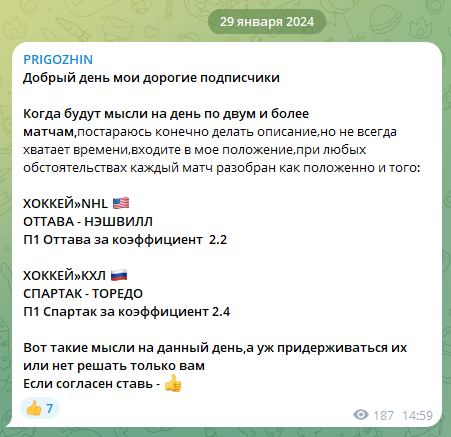 PRIGOZHIN – паблик в Телеграме, который ведет каппер PRIGOZHIN777. Он запущен 26 апреля 2023 года и позиционируется как проект для начинающих беттеров. Основатель канала обещает ежедневные прогнозы на спортивные события с высокой проходимостью.