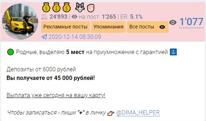 - Аналитик сообщает подписчику, что для получения выигрыша необходимо оплатить комиссии, заплатить налог или пройти верификацию за определенную сумму.